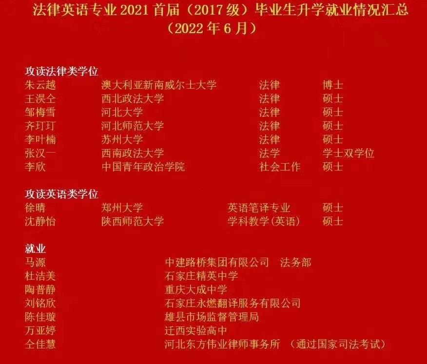 本專業(yè)面向全國(guó),為適應(yīng)經(jīng)濟(jì)轉(zhuǎn)型升級(jí)和經(jīng)濟(jì)社會(huì)發(fā)展、立足河北涉外法律服務(wù)領(lǐng)域需求,培養(yǎng)具有創(chuàng)新精神和實(shí)踐能力、具有扎實(shí)的英語基本功和寬廣的英美法知識(shí)、良好道德修養(yǎng)、社會(huì)責(zé)任和國(guó)際經(jīng)貿(mào)法律環(huán)境意識(shí)強(qiáng)的高素質(zhì)、應(yīng)用型、復(fù)合型涉外法律英語人才;掌握寬廣的英語語言知識(shí)和英美法律知識(shí),熟悉中國(guó)法律體系;具備英語言溝通協(xié)作、法律英語語言交際和服務(wù)綜合應(yīng)用能力;能夠從事法庭口譯、法律筆譯工作;參與或代理涉外法律訴訟或仲裁, 熟悉涉外法務(wù);從事法律語篇和案例分析研究和交流;具有較高的人文素養(yǎng)和法律文化交際能力;比較法律學(xué)習(xí)能力;具有創(chuàng)新意識(shí)和國(guó)際視野。