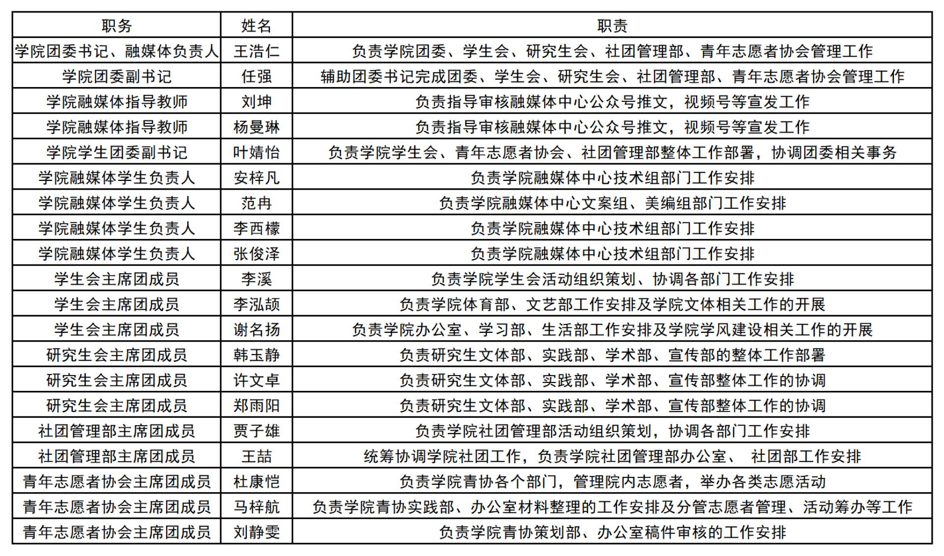 (1)工作的職責(zé):統(tǒng)籌、協(xié)調(diào)和落實(shí)院團(tuán)委的日常工作,并及時(shí)向書記、副書記匯報(bào)。