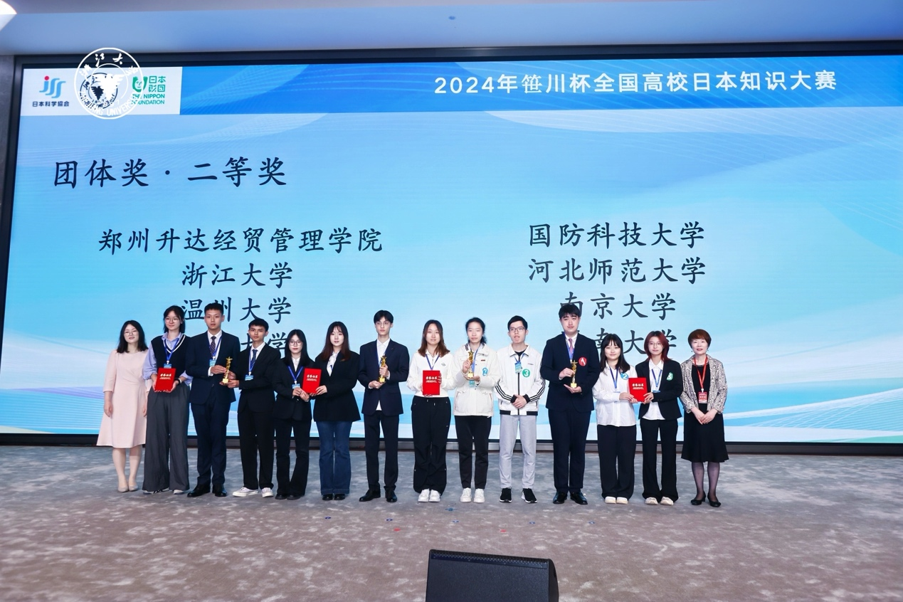 2024年10月25日至27日,由浙江大學(xué)與日本科學(xué)協(xié)會共同主辦,并獲得日本財團(tuán)特別贊助的2024年“笹川杯”全國高校日本知識大賽在浙江大學(xué)成功舉辦。來自北京大學(xué)、南京大學(xué)、中國人民大學(xué)、北京外國語大學(xué)、上海外國語大學(xué)、天津外國語大學(xué)等全國100所高校的近400名師生齊聚一堂,經(jīng)過兩天的精彩比拼決出了團(tuán)體及個人賽的獎項。我院日語系2022級畢瑛琪、孫思雅同學(xué)以及商學(xué)院2021級劉朝武同學(xué)組成的聯(lián)合隊伍參加角逐,團(tuán)隊由日語系張敏老師指導(dǎo)并陪同前往。經(jīng)過緊張激烈的比拼后,我校代表隊不負(fù)眾望,在眾多參賽隊伍中脫穎而出,最終取得了團(tuán)體賽全國二等獎!同時,日語專業(yè)學(xué)生孫思雅同學(xué)以其出色的表現(xiàn)獲得了個人賽優(yōu)秀獎,張敏老師獲得團(tuán)體杰出指導(dǎo)教師獎。
