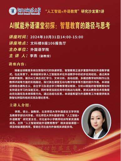 2024年10月31日下午,研究室主任李燕老師以“AI賦能外語課堂初探:智慧教育的路徑與思考”為題,面向全院教職工進行了學(xué)院“人工智能+外語教育”研究沙龍第1講。李老師在講座中分享了人工智能技術(shù)在外語教學(xué)中的應(yīng)用經(jīng)驗,通過具體的教學(xué)案例,展示AI工具在詞匯學(xué)習(xí)、文本分析、自動出題、多模態(tài)教學(xué)材料制作以及教師評閱等方面的實踐路徑,探討其在課堂互動與教學(xué)效率等方面的提升作用。