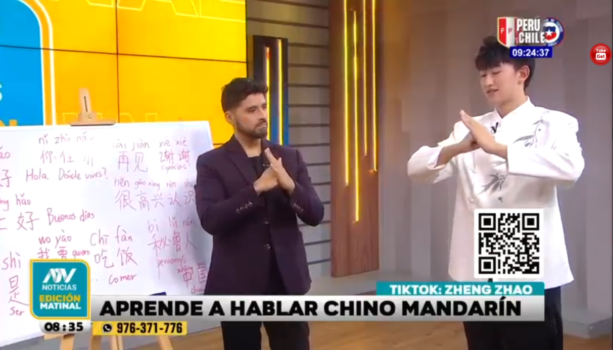 2020級西班牙語專業(yè)王鍶淼,于今年6月畢業(yè)后前往秘魯里卡多?帕爾馬大學(xué)孔子學(xué)院擔(dān)任志愿教師。他在教授中文課的同時,參與當(dāng)?shù)匚幕顒樱e極推介中國文化。峰會期間,王鍶淼同學(xué)發(fā)揮語言優(yōu)勢,為當(dāng)?shù)匕脖H藛T提供中文培訓(xùn)服務(wù)。同時,他受邀參加當(dāng)?shù)仉娨曨l道ATV Noticias的一檔節(jié)目,向秘魯觀眾介紹中文和中國傳統(tǒng)文化。