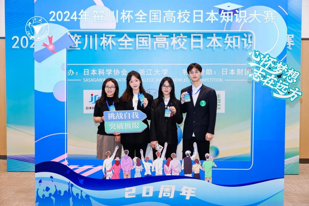 2024年10月25日至27日,由浙江大學(xué)與日本科學(xué)協(xié)會共同主辦,并獲得日本財團(tuán)特別贊助的2024年“笹川杯”全國高校日本知識大賽在浙江大學(xué)成功舉辦。來自北京大學(xué)、南京大學(xué)、中國人民大學(xué)、北京外國語大學(xué)、上海外國語大學(xué)、天津外國語大學(xué)等全國100所高校的近400名師生齊聚一堂,經(jīng)過兩天的精彩比拼決出了團(tuán)體及個人賽的獎項。我院日語系2022級畢瑛琪、孫思雅同學(xué)以及商學(xué)院2021級劉朝武同學(xué)組成的聯(lián)合隊伍參加角逐,團(tuán)隊由日語系張敏老師指導(dǎo)并陪同前往。經(jīng)過緊張激烈的比拼后,我校代表隊不負(fù)眾望,在眾多參賽隊伍中脫穎而出,最終取得了團(tuán)體賽全國二等獎!同時,日語專業(yè)學(xué)生孫思雅同學(xué)以其出色的表現(xiàn)獲得了個人賽優(yōu)秀獎,張敏老師獲得團(tuán)體杰出指導(dǎo)教師獎。